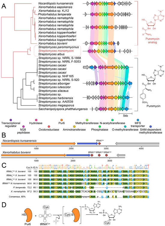 Pur6-guided genome mining revealed the biodiversity of puromycin analogs in Streptomyces and Xenorhabdus. (A) Pur6 and its homologs are strongly associated with BGC of puromycin-like secondary metabolites. The phylogenetic tree indicates the distance between Pur6 homologs in various bacteria. The corresponding genomic context and puromycin BGCs are colored with grey and rainbow, respectively. Putative BGCs associated with puromycin biosynthesis and biosynthesis of puromycin-like analogs are united by brackets and colored with black and red, respectively. Putative new analogs of puromycin in streptomycetes are highlighted with a red dotted line. (B) BGCs of puromycin-like secondary metabolites in Nocardiopsis kunsanensis and Xenorhabdus bovienii have cysteine tRNA. (C) Sequences of tRNACys and similar RNA sequences encoded in the genomic context of BGCs of puromycin-like secondary metabolites. (D) Putative reaction scheme illustrating a potential working principle of Pur6-like enzymes.