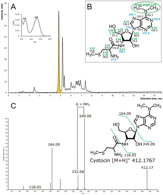 (A) rp-HPLC of the active fraction (Agilent HC-C18(2) 4.6 × 150 mm, 5 μm, eluent: solvent A—10 mM NH4OAc, pH 5, solvent B—MeCN, gradient elution from 15 to 90 solvent B for 10 min, flow rate 1.5 mL/min, UV 275 nm, sample volume 2 uL, active component is highlighted with yellow. (B) The structure of Cst with the indication of NMR chemical shifts in DMSO-d6 at 35 °C. Green numbers stand for the 1H chemical shifts, black—for the 13C, and blue—for 15N. Chemical shifts are provided in ppm, measured with respect to trimethylsylan as an external reference standard. 13C and 15N shifts were referenced indirectly, using the gyromagnetic ratios as implemented in Topspin software (Bruker Biospin Gmbh, Germany). (C) The positive mode HCD mass spectra of Cst and proposed fragmentation of the parent ion of the compound at m/z 412.17.