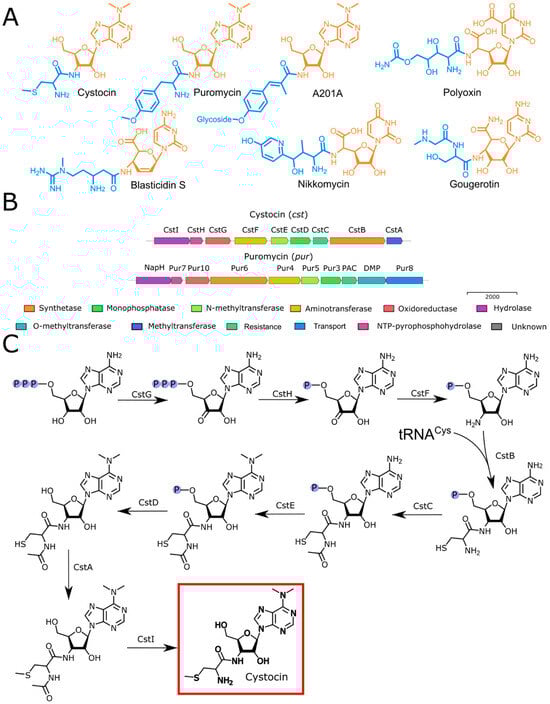 The phylogenetic analysis using the 16S rRNA gene sequence derived from the genome assembly revealed that the Cst-producing strain Streptomyces sp. VKM Ac-502 was closely related to S. monomycini NRRL B-24309T, S. ochraceiscleroticus NRRL ISP-5594T, and S. violens NRRL ISP-5597T (Figure S1). The analysis of the complete genome sequence showed the aminonucleoside BGC, which was named the cst BGC. Cst belongs to a diverse group of peptidyl nucleoside antibiotics []. The compounds of similar biosynthetic origin contain a nucleoside core and peptidyl moiety (Figure 4A). While the biosynthesis of Puro has been studied in detail [,,,,,,,,,,,], as far as we know, the biosynthesis of Cst has not been reported.