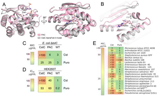 CstC mediates resistance to cystocin. (A) Structural alignment of the CstC AlfaFold 3 model (grey) with the PAC-PuroOAc-CoA complex (pink), PDB ID 7K0A. (B) Antibiotic-binding pocket of CstC and PAC. The 31 and 49 positions located proximately to the aminoacyl residue of Puro-OAc are highlighted with sticks. (C) Comparison of bacterial susceptibility for E. coli ΔtolC and E. coli ΔtolC producing CstC or PAC. (D) Cytotoxicity of Cst and Puro toward human cell line HEK293T and HEK293T producing CstC or PAC. (E) Heat map of MICs of Cst and Puro against Gram-positive and Gram-negative bacteria.