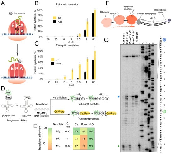 Cst mode of action. (A) Schematic representation of Puro mode of action. In vitro prokaryotic (B) and eukaryotic (C) protein synthesis inhibition by Puro and Cst. (D) Fluorescently labeled short peptides synthesis inhibition assay scheme, labeled peptides MF2 and MF4 are synthesized with coupled transcription–translation from exogenically formed loaded tRNA and visualized using PAGE with fluorescent detection. BPY—BODIPY. (E) Heatmap of normalized intensity of full-length peptides under treatment with Cst/Puro. (F) The principal scheme of toe-printing analysis. (G) Toe-printing analysis for Cst/Puro. The green arrow indicates the position of ribosome capture on the Thr codon; the blue arrow indicates the start codon. Ths—thiostrepton.