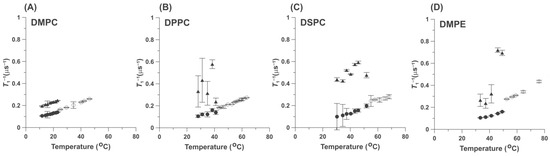 Figure 2 contains data for saturated PC membranes with different acyl chain lengths: 14C for DMPC (Figure 2A), 16C for DPPC (Figure 2B), and 18C for DSPC (Figure 2C). In these measurements, the 5-PC concentration was 0.25 mol%. Figure 2D presents data for saturated polyethylene membranes (DMPE with 14C). The concentration of 5-PC in these measurements was 1 mol%. Results showed that the pattern of the changes of T1−1s of 5-PC is the same regardless of the length of the acyl chains (the thickness of the membrane) and the type of HPL. Single T1−1 values were observed above the phase transition temperature of the membranes made of the HPL, and two T1−1s values were observed below the phase transition temperature. It should be noted that the main phase transition temperatures of the phospholipids (PC) membranes increase with the length of the acyl chains from 23.6 °C for DMPC, 41.2 °C for DPPC, and 55 °C for DSPC [27,28,29,30,31,32]. The phase transition for DMPE occurs at 48 °C [33,34]. The T1−1 describes the property of the 5-PC molecules, namely its rate of rotational diffusion. The single value of T1−1 observed above the phase transition temperatures indicates that at the same temperature, all 5-PC molecules rotate at the same rate. Of course, this rate increases with temperature for all HPL membranes. More complex but interesting patterns of changes of T1−1s were observed below the phase transition temperature of the HPLs. At each temperature, two T1−1 values were observed, indicating that 5-PC properties in these two pools were very different. The rotational diffusion rate of 5-PC molecules in one pool was very low, as is expected for the gel phase membranes, while the 5-PC rotational rate was high in the other pool, comparable to or even greater than that indicated by the T1−1 of 5-PC in the fluid phase (above the phase transition temperature; see Figure 2). When the rotational diffusion rates for the different HPL bilayers are compared at the same temperatures, the values measured for the less fluid components (i.e., those in the gel phase pool) are close. Thus, the fluidity sensed by the 5-PC molecules is independent of the membrane thickness. We cannot make such a comparison for fluid domains created below the phase transition temperatures of the HPL bilayers. Data were unexpectedly scattered, clearly showing the existence of two SR EPR signal components below the phase transition temperatures of the HPLs. That may be due to an increased spin-spin interaction between 5-PCs confined in small but fluid domains. We assume that, in the gel phase bilayers, 5-PC molecules are rather uniformly distributed with concentrations close to 0.25 mol%. Of course, the fluid phase domains cannot be created by only 5-PCs because, in that case, the EPR signals will be broadened to zero amplitude. So, the fluid phase domains contain mixtures of 5-PC and HPL molecules, which possess greater fluidity (rotational diffusion) than the surrounding molecules in the bulk gel phase. The local concentration of 5-PC in these fluid phase domains can be greater than that in the gel phase, and their translational diffusion coefficients can be greater because domains are more fluid (see Section 2.2.2). All these factors should affect (i.e., shorten) the spin-lattice relaxation time of 5-PC.