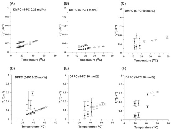 Spin-lattice relaxation rates (T1−1) of 5-PC (0.25 (A) 1 (B), and 10 mol% (C)) in DMPC bilayers and 5-PC (0.25 (D), 10 (E), and 20 mol% (F)) in DPPC bilayers plotted as a function of temperature. Filled symbols indicate data obtained below the phase transition temperatures of the appropriate HPL. Results obtained below the temperatures of the main phase transitions of the appropriate HPL and assigned to the gel phase membranes (●) and to the fluid phase (▲). Open symbols(o) indicate data obtained above the phase transition temperatures of the appropriate HPL and assigned to the fluid phase.