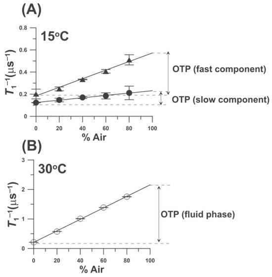 T1−1(Air, x) and T1−1(N2, x) are the spin-lattice relaxation rates of the nitroxide in samples equilibrated with atmospheric air and nitrogen, respectively [20,36,37]. OTP is proportional to the product of the local translational diffusion coefficient D(x) and the local concentration C(x) of oxygen at the local environment of the nitroxide when the sample is equilibrated with the atmospheric air, r0 (about 4.5 Å) is the interaction distance between oxygen and the nitroxide [38], and p is the probability that an observable event occurs when a collision occurs and is very close to one [17,20,36]. Thus, to obtain the value of the OTP, two SR EPR signals must be measured: one for the deoxygenated sample and the other for the sample equilibrated with air. The value of the OTP is normalized to the atmospheric partial pressure of oxygen in the air surrounding the sample capillary, namely 159.6 mmHg. In the presence of air, T1s are often too short to be recorded. Thus, to increase the accuracy of the T1−1(Air, x) measurements, the value is obtained by extrapolating the linear plot of T1−1 as a function of oxygen concentration (in % air) in the equilibrating gas mixture, and extrapolation results to atmospheric air (100% air). This procedure is shown in Figure 4 for results obtained for one-component (Figure 4B) and two-component SR signals (Figure 4A). Thus, the local environment of the nitroxide moiety is characterized by the OTP parameter, which is very sensitive to the local (around the nitroxide fragment) oxygen diffusion-concentration product. Small variations in the organization of lipids affect oxygen solubility and oxygen diffusion, which can be detected by an increase in the T1−1 of the nitroxide. OTPs were measured for DMPC bilayers with 0.25 mol%, 1 mol% and 10 mol% of 5-PC and for DPPC bilayers with 0.25 mol%, 10 mol%, and 20 mol% 5-PC. Cumulative data and explanations are presented in Section 2.2.2.