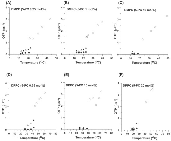 Values of the OTP obtained with 5-PC (0.25 mol% (A), 1 mol% (B) and 10 mol% (C)) in DMPC bilayers and 5-PC (0.25 mol% (D), 10 mol% (E), and 20 mol% (F)) in DPPC bilayers plotted and as a function of temperature. Filled symbols indicate data obtained below the phase transition temperatures of the appropriate HPL. Results obtained below the temperatures of the main phase transitions of the appropriate HPL and assigned to the gel phase membranes (●) and to the fluid phase (▲). Open symbols(o) indicate data obtained above the phase transition temperatures of the appropriate HPL and assigned to the fluid phase.