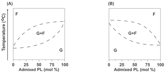Schematic phase diagrams for the binary PL mixtures for the case when the phase transition temperature of the admixed PL was higher than that of the HPL (A) and when the phase transition temperature of the admixed PL was lower than that of the HPL (B). F denotes the single fluid phase region, and G denotes the single gel phase region. G + F denotes the region where both phases coexist.