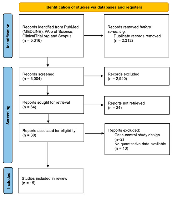 After removing duplicates, 3004 abstracts were screened for inclusion. Then, 64 full-text articles were assessed for eligibility. We excluded 34 of these, leaving 30 publications to be included. Fifteen articles were further excluded because no quantitative data were available (n = 13) or for the wrong study design (n = 2). Finally, 15 articles were included in the review [16,17,18,19,20,21,22,23,24,25,26,27,28,29,30]. The selection process is described in Figure 1.