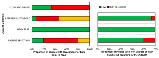 Proportion of studies with a low, high or unclear risk of bias and concerns regarding applicability according to the QUADAS-2 domains.