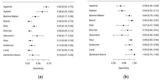 Overall, 10 studies assessed the diagnostic accuracy of Ara h 9, using 0.35 kU/L (seven studies) and/or 0.1 kU/L (four studies) cut-offs. All the studies had a cross-sectional design and were conducted in Europe, except for the study by Kaur et al. that was conducted in Australia and the one by Aytekin et al. in Africa. Figure 3a,b show forest plots summarizing the sensitivity and specificity of Ara h 9 for the diagnosis of peanut allergy.