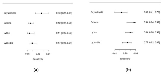 Three studies enrolled patients with suspected hazelnut allergy. Figure 4a,b show forest plots summarizing the sensitivity and specificity of Cor a 8 for the diagnosis of hazelnut allergy in the included studies.