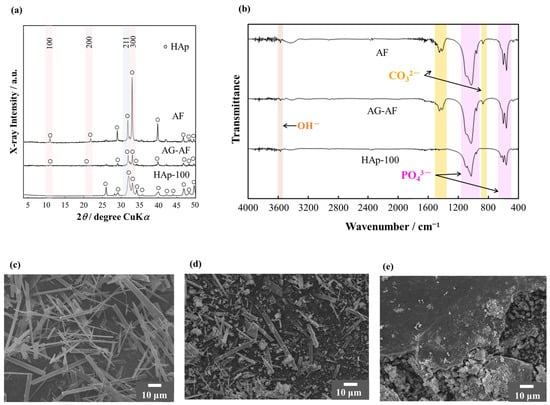 Characterization of AF, AG-AF, and HAp-100 powder: (a) X-ray diffraction (XRD) patterns and (b) FTIR spectra. Particle morphology of (c) AF, (d) AG-AF, and (e) HAp-100 powder.