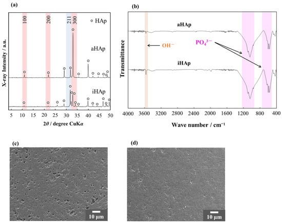 Characterization of aHAp and iHAp ceramics: (a) XRD patterns and (b) FTIR spectra. SEM images of (c) aHAp and (d) iHAp.