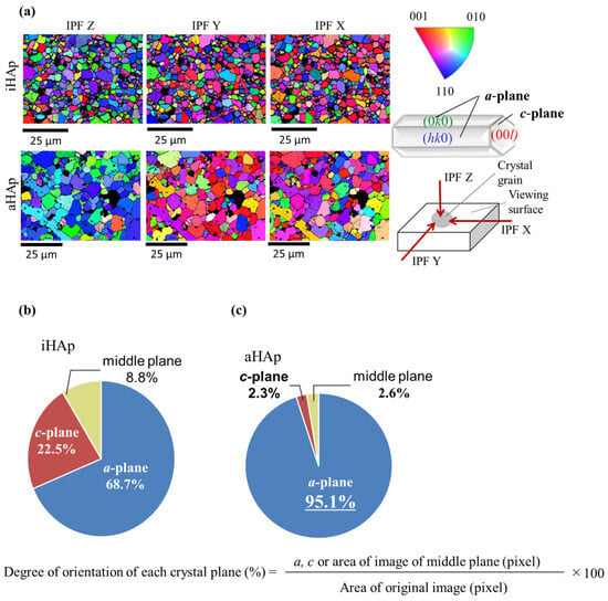 Crystal orientation distribution and quantitative evaluation of the degree of orientation for the fabricated ceramics: (a) EBSD images of the ceramics (The a-plane of HAp indicates green or blue, and the c-plane indicates red in this study) and (b) quantitative results of the crystal orientation distribution map of iHAp and (c) aHAp (the degree of orientation of each crystal plane was calculated using the above formula).