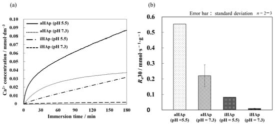 Figure 4a shows the change over time in the concentration of Ca2+ ions when iHAp and aHAp were immersed in acidic and neutral solutions, as defined in the Japanese Industrial Standards (JIS) T 0330-3 []. The results indicated that aHAp was more soluble in both environments compared with iHAp. Figure 4b shows the average dissolution rate per unit mass. Under acidic conditions, the rates in first 180 min dissolution rates of aHAp and iHAp reached 0.553 and 0.0824 mmol·s−1·g−1, respectively. In addition, under neutral conditions, the rate of aHAp and iHAp was 0.221 and 0.00928 mmol∙s−1∙g−1, respectively. Hence, the abovementioned results indicated that aHAp was about 6.7 times more soluble than iHAp when under acidic conditions. By contrast, aHAp was about 23 times more soluble than iHAp when under neutral conditions.