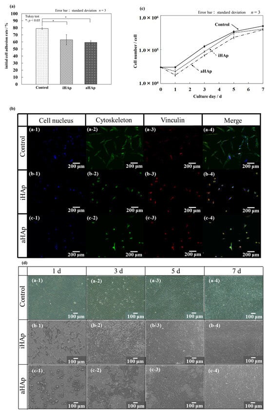 Initial cell-adhesion rates and growth behavior on fabricated ceramics. (a) Initial cell-adhesion rates. (b) Fluorescent immunostaining results for cells in the cell nucleus, cytoskeleton, and vinculin after 5 h of incubation ((a-1)–(a-4) control, (b-1)–(b-4) iHAp, and (c-1)–(c-4) aHAp). (c) Growth curves of cells cultured on ceramics. (d) Cell morphology after culturing on ceramics ((a-1)–(a-4) control, (b-1)–(b-4) iHAp, and (c-1)–(c-4) aHAp).