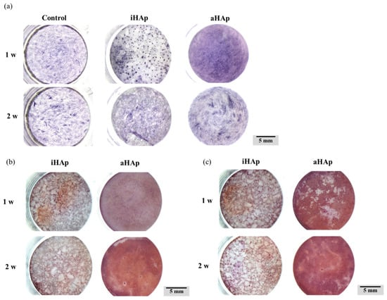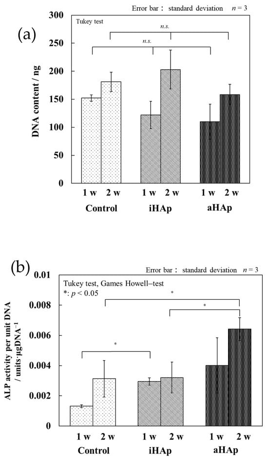 Figure 7a shows the DNA content of MG-63 cultured in an osteo-differentiation environment on each specimen. The amount of DNA tended to increase during culture. However, no significant differences were observed among the cultured specimens at each culture week. The ALP activity values of MG-63 cultured on each specimen are shown in Figure 7b. Significant differences were observed between the control group and iHAp at one week of incubation using a bone differentiation induction medium. By contrast, no significant differences were observed between iHAp and aHAp. After using a bone differentiation induction medium for two weeks, aHAp showed the highest value, with significant differences between aHAp and the control group, as well as between aHAp and iHAp.