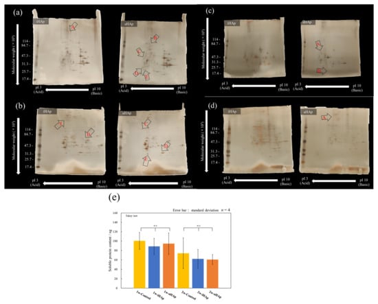 The results of the one-week culture are shown in Figure 8a,b. The area indicated by “A” was observed only for iHAp. On the contrary, the proteins expressed at the sites shown in “B–E” were enriched in aHAp. In addition, the results for the insoluble proteins shown in Figure 8b indicated that “A” and “B” were more intensely expressed than aHAp, whereas the locations shown in “C–E” were more intensely expressed than iHAp.
