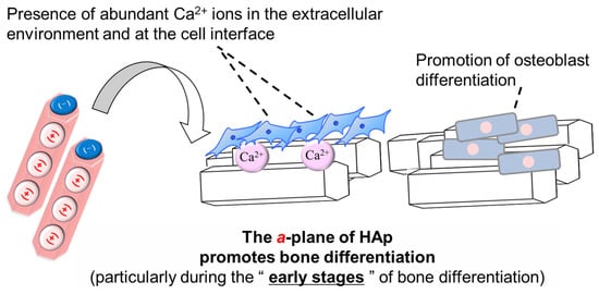 The results of ARS staining indicated that aHAp promoted osteoblast differentiation compared with iHAp. In particular, aHAp promoted bone differentiation compared with iHAp, even without a bone differentiation induction medium. Therefore, the a-plane of HAp promotes bone differentiation, especially in the early stages of bone differentiation. These results may be related to the Ca2+ ion concentrations shown in Figure 4. Maeno et al. reported that moderate Ca2+ ion concentrations promoted osteoblast differentiation []. According to Yanai et al., Ca2+ ions in the extracellular environment stimulated the mesenchymal stem cells of the nuclear factor of activated T cell signaling pathway, thereby influencing bone differentiation []. The results of their study were similar to those of the present study. In addition, the increased Ca2+ ion concentration at the interface between the aHAp surface and cells may induce bone differentiation (Figure 9). Yanagi et al. also reported the effect of bone regeneration using adipose-derived mesenchymal stem cells in monolayer and 3D spheroidal cultures. The results indicated that cells cultured in spheroid form had higher osteogenic potential than those cultured in a monolayer form []. Therefore, the ability of aHAp to promote cell aggregation may be a factor influencing the effect of aHAp on bone differentiation.