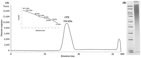 The molecular weight of the CPS was analyzed using HPLC (Agilent 1100 Series, Hamburg, Germany) equipped with successively connected columns of Shodex Asahipak GS-520 HQ and GS-620 HQ (7.5 mm × 300 mm) at 50 °C with elution by 0.15 M NaCl (0.4 mL/min). Columns were calibrated using standard dextrans of 4–400 kDa (Sigma, St. Louis, MO, USA). The electrophoresis of the CPS was performed as described in [11].