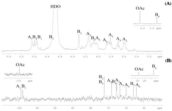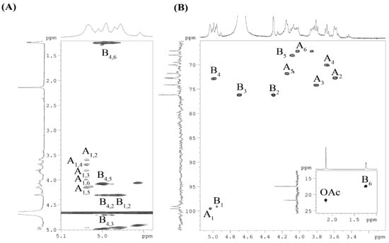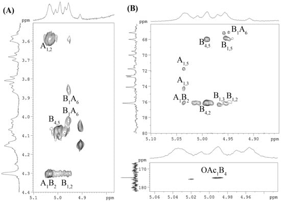 The 1H NMR spectrum of the CPS (Figure 2A) showed three signals in the anomeric region at δH 5.04 (H-1 of residue A), 4.99 (H-4 of residue B, see below) and 4.96 (H-1 of residue B) and in the carbinolic region at δH 3.59–4.69 (overlapping with HDO from solvent); furthermore, one O-acetyl group and one methyl group of 6-deoxysugar at δH 2.14 and 1.24 (3JH5-H6 5.3 Hz, H-6 of residue B), respectively, were detected. The 13C NMR spectrum of the CPS (Figure 2B) showed, inter alia, two signals in the anomeric region at δC 99.6 (C-1 of residue A) and 99.1 (C-1 of residue B); one substituted hydroxymethyl group at δC 67.1 (C-6 of residue A, data from DEPT-135 experiment); one methyl group of an O-acetyl substituent at δC 21.7; and one methyl group of 6-deoxysugar at δC 17.5 (C-6 of residue B).