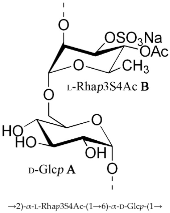 A significant downfield displacement of the C-3 signal of residue B at δC 76.2 compared to the chemical shift in the corresponding non-substituted monosaccharide [22] indicated the location of the sulfate group (O-3 of α-L-Rhap).