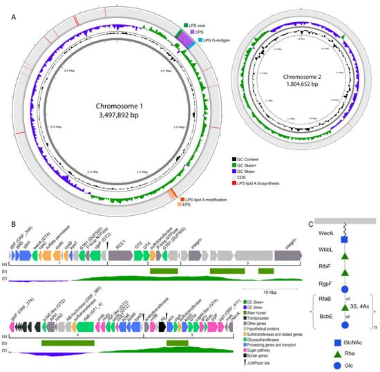 The complete genome of Vibrio sp. KMM 8419 was assembled de novo and found to consist of two circular chromosomes (3,497,892 bp and 1,804,652 bp) (Figure 6) and one plasmid (241,015 bp). The genome contains 4778 CDSs, 113 tRNAs and 30 rRNA genes (organized into ten 16S-23S-5S operons). A search for polysaccharide-related genes revealed the genes encoding the biosynthesis of EPS, core oligosaccharide of LPS, O-antigen and the lipid A modification. Most of them were organized into gene clusters on chromosome 1, while the genes encoding for lipid A biosynthesis were distributed along this chromosome, except for lptD, which was found on chromosome 2 (Figure 6A).
