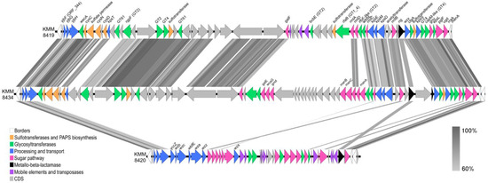 The study of genetic cluster structure becomes essential not only for obtaining insight into the fundamental basis of the diversity of polysaccharide structures but also for their biotechnological production. The genetic organization of gene clusters encoding the biosynthesis of CPS in Vibrio spp. has been previously described [41,42,43,44]. These studies have identified CPS gene cluster borders from gmhD (encoding ADP-L-glycero-D-manno-heptose-6-epimerase, EC 5.1.3.20) to rjg (encoding triosephosphate isomerase, EC 5.3.1.1) or glpX (encoding fructose-1,6-bisphosphatase, EC 3.1.3.11) in most strains of V. cholerae and V. parahaemolyticus. However, in the genomes of KMM 8419, KMM 8434 and KMM 8420, the boundaries of the CPS gene cluster were expanded to rraA/menA, probably due to the inclusion of O-antigen biosynthesis genes. A similar structural organization has previously been described for other Vibrio species, namely a CPS/O-antigen locus [41,44].