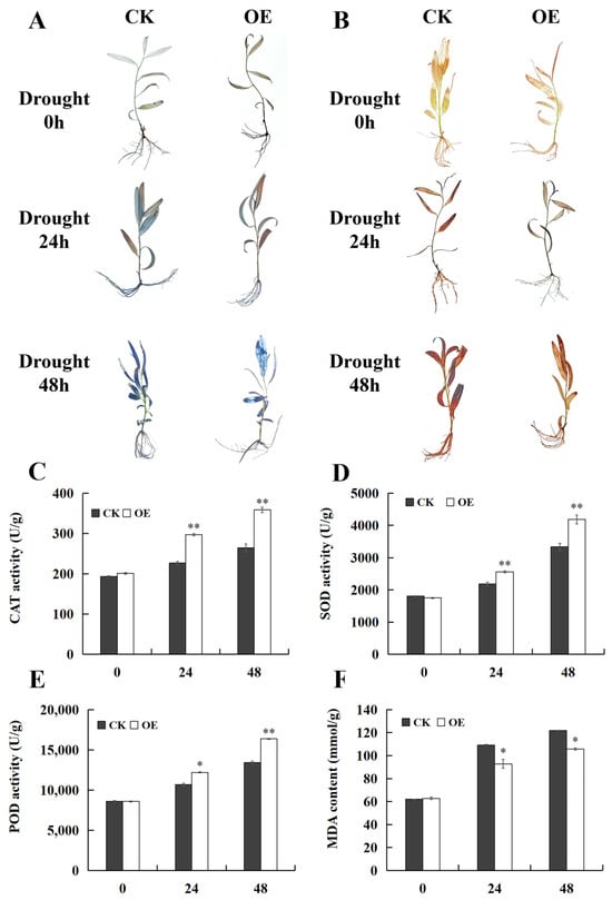 4.5. Transient Overexpression of SpPP2C80 in S. Psammophila and Drought Resistance Analysis