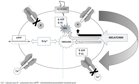 Melatonin—mechanisms of action: melatonin → ATP-sensitive potassium channels—stimulating effect; and melatonin → ROS/swelling—inhibitory effect. up arrow—increased, down arrow—decreased. For further explanations, see text.