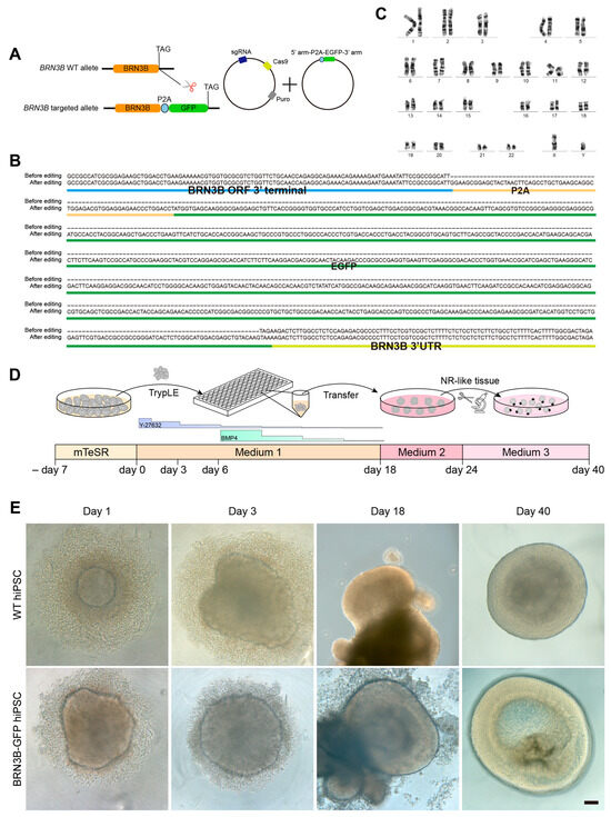 The POU domain transcription factor BRN3B has been demonstrated to serve as a pivotal regulator in the specification and differentiation of RGCs [24,25,26,27,28]. It is indispensable for the development of approximately 70% of mouse RGCs and exhibits specific expression within RGC precursors and mature RGCs in embryonic and postnatal mouse retinas [25,26,27]. Consequently, BRN3B stands out as a specific marker for both early and mature RGCs. We utilized a hiPSC reporter line previously generated by CRISPR/Cas9 gene editing to efficiently label and enrich RGCs from 3D retinal organoids. This technique entailed the fusion of the eGFP reporter gene to the BRN3B open reading frame through a P2A self-cleaving peptide sequence (Figure 1A), leading to the establishment of the BRN3B-GFP hiPSC line [20]. Sequencing confirmed precise insertion at the correct position (Figure 1B). Additionally, the BRN3B-GFP hiPSC line maintained a normal karyotype (Figure 1C).