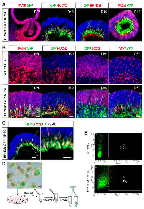 Labeling of RGC precursors by GFP in BRN3B-GFP retinal organoids and their enrichment by fluorescence-activated cell sorting (FACS). (A) BRN3B-GFP retinal organoid sections from the indicated time points were double-immunostained for GFP and PAX6, HUC/D, or BRN3B, followed by DAPI counterstaining. GFP+ RGC precursors were observed within the inner layer of the organoid after day 40, which co-expressed RGC protein markers HUC/D, BRN3B or PAX6. There was no GFP expression on day 27. (B) Sections from 60-day retinal organoids derived from wild-type (WT) and BRN3B-GFP hiPSCs were double-immunolabeled with an anti-GFP antibody and antibodies against the indicated protein markers and then counterstained with DAPI. In BRN3B-GFP retinal organoids, GFP was seen in differentiating RGCs co-expressing PAX6 or HUC/D but not in retinal progenitor cells expressing PAX6 or SOX2 or in photoreceptor precursor cells expressing OTX2. (C) Sections of 40-day BRN3B-GFP retinal organoids were double-immunostained with antibodies against GFP and BRN3B and counterstained with DAPI. The right panel is a magnification of the part in the dotted box. RGC precursors (GFP+BRN3B+) were seen in the inner layer. (D) Schematic illustrating the process of enriching GFP+ precursors derived from 40-day BRN3B-GFP retinal organoids by FACS. The green dots represent GFP+ cells. The image above depicts the morphology of retinal organoids with GFP fluorescence confined to the inner regions. (E) Cells expressing BRN3B-GFP were sorted by FACS, resulting in an enrichment of GFP-positive RGC precursors. Single cells from 40-day WT retinal organoids were utilized for control gating (upper panel). Scale bar: (A,C) 40 μm; (B) 20 μm; (D) 200 μm.