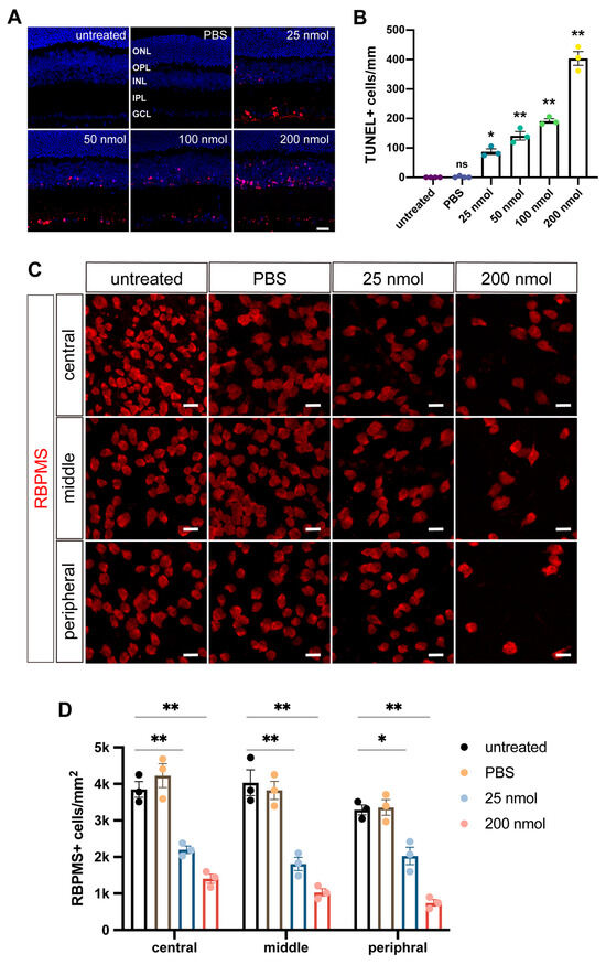 Evaluation of retinal damage post intravitreal injection of different dosages of NMDA. (A) TUNEL analysis of mouse retinal cryosections was performed 24 h post NMDA injection. Cells labeled with tetramethylrhodamine-deoxyuridine triphosphate (TMR dUTP, red) indicate DNA fragmentation, which signifies apoptosis. “Untreated” denotes the control group, “PBS” represents PBS injection, while 25 nmol, 50 nmol, 100 nmol, and 200 nmol refer to NMDA injection doses. The retinal layers are labeled as follows: ONL (outer nuclear layer), OPL (outer plexiform layer), INL (inner nuclear layer), IPL (inner plexiform layer), and GCL (ganglion cell layer). (B) Histogram showing the number of TUNEL-positive apoptotic cells in the retina post-intravitreal injection of varying doses of NMDA. Data are shown as mean ± SEM (n = 3 or 4). Statistical significance was determined using one-way ANOVA followed by Dunnett’s post hoc test: ns, not significant; * p < 0.001; ** p < 0.0001. (C) Representative images of RBPMS-positive RGCs in the central, middle, and peripheral regions of the retina 7 days after intravitreal injection of the indicated doses of NMDA. (D) Quantification of RBPMS+ RGCs in each indicated group in the central, middle, and peripheral regions of the retina. Data are presented as mean ± SEM (n = 3). Statistical significance was determined using two-way ANOVA followed by Dunnett’s post hoc test: * p < 0.001; ** p < 0.0001. Scale bar: (A,C) 20 μm.