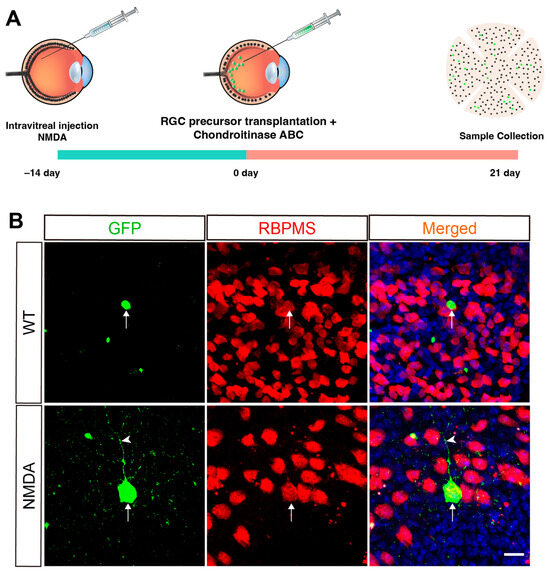 Transplantation of RGC precursors from the BRN3B-GFP retinal organoids into the mouse retina. The green dots represent GFP+ cells. (A) Timeline of NMDA injection and RGC precursor transplantation. (B) Transplanted whole-mount retinas from wild-type (WT) and NMDA-injured mice were double-immunostained with antibodies against GFP and RBPMS and counterstained with DAPI. Arrows point to the transplanted cells co-expressing GFP and RBPMS, and the arrowhead indicates a GFP-positive neurite. Scale bar: (B) 20 μm.