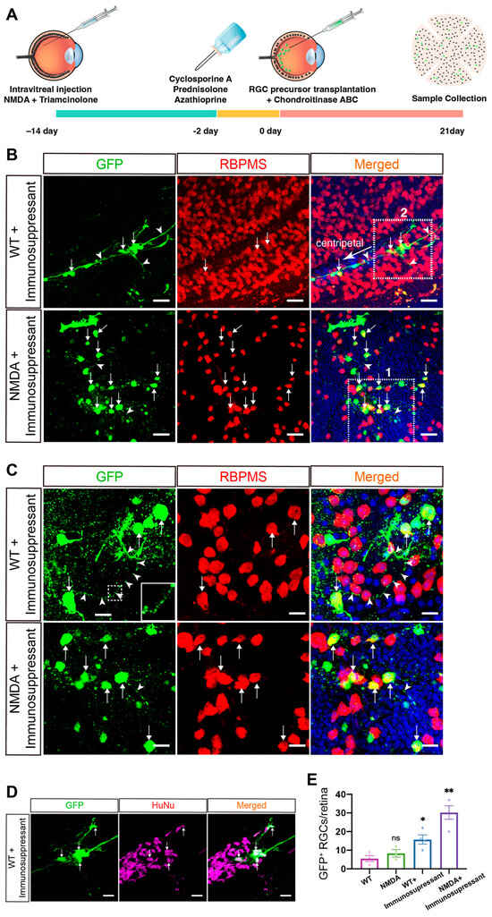 Transplantation of RGC precursors into the retinas of mice administered immunosuppressants. (A) Timeline of NMDA injection, immunosuppressant administration, and RGC precursor transplantation. The green dots represent GFP+ cells. (B,C) Transplanted whole-mount retinas from wild-type (WT) and NMDA-injured mice were double-immunostained with antibodies against GFP and RBPMS and counterstained with DAPI. The small arrows point to the transplanted cells co-expressing GFP and RBPMS, and the arrowheads indicate GFP-positive neurites/nerve bundles. The big arrow in (B) points to the centripetal direction. The inset in (C) shows a corresponding outlined region at a higher magnification to visualize an axon segment with varicosities. The lower panels in (C) are higher-magnification views of the outlined area 1 in (B). (D) Higher magnification views of the outlined area 2 in (B) show cells immunoreactive for GFP, HuNu, or both, with DAPI counterstaining. Arrows point to the transplanted cells co-expressing GFP and HuNu. (E) Quantification of RBPMS+ RGCs derived from transplanted GFP+ precursor cells in each indicated group. Data are presented as mean ± SEM (n = 3–4). Statistical significance was determined using one-way ANOVA followed by Dunnett’s post hoc test: ns, not significant; * p < 0.05; ** p = 0.01. Scale bar: (C,D) 20 μm; (B) 40 μm.