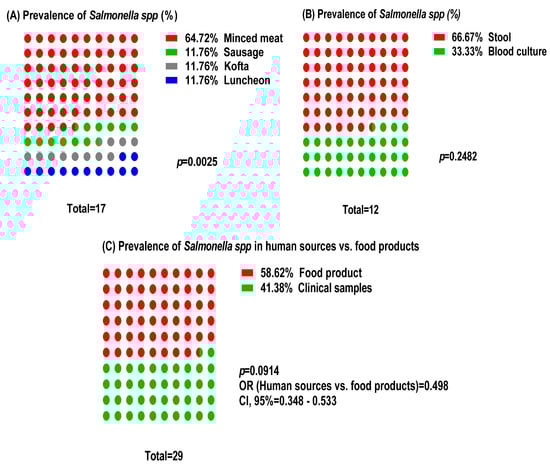 The prevalence of Salmonella spp. was significantly higher in minced meat (n = 11/21, 64.27%) compared to other food products (sausage, kofta, and luncheon meat; 11.76%; p = 0.0025; Figure 1A). In human samples, there was no significant difference in Salmonella prevalence between stool (66.67%) and blood cultures (33.33%) from patients with gastrointestinal symptoms (p = 0.2482; Figure 1B). Overall, Salmonella spp. was detected in a higher proportion of food samples (72.41%) compared to human samples (50.20%) (OR = 0.498; p = 0.0914; Figure 1C).