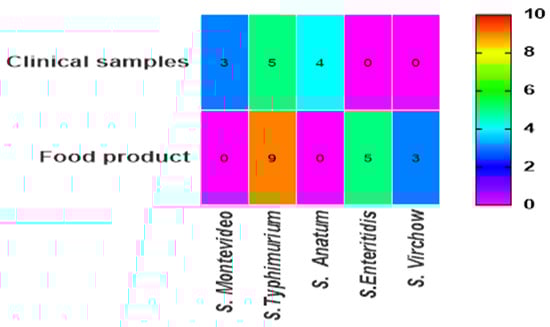 Regarding serotypes, S. Typhimurium was the predominant serotype, with a higher prevalence in food samples (64.29%) compared to human samples (35.71%) (Figure 2). Notably, S. Enteritidis and S. Virchow were not detected in clinical samples, and S. Montevideo and S. Anatum were absent from food products.