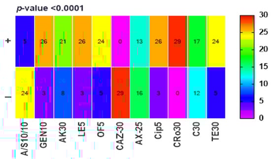 Salmonella isolates exhibited a high level of susceptibility to the majority of antibiotics tested (p < 0.0001). However, resistance was observed to ampicillin/sulbactam, ceftazidime, amoxicillin, and chloramphenicol (Figure 3). This trend was corroborated by the multiple antibiotic resistance (MAR) index, with minced meat isolates demonstrating the highest resistance compared to luncheon meat. Alarmingly, 86.2% (25/29) of isolates displayed a multidrug-resistant (MDR) phenotype (Table 1). Ceftriaxone was the most effective antibiotic among those tested and served as a comparator for subsequent experiments.