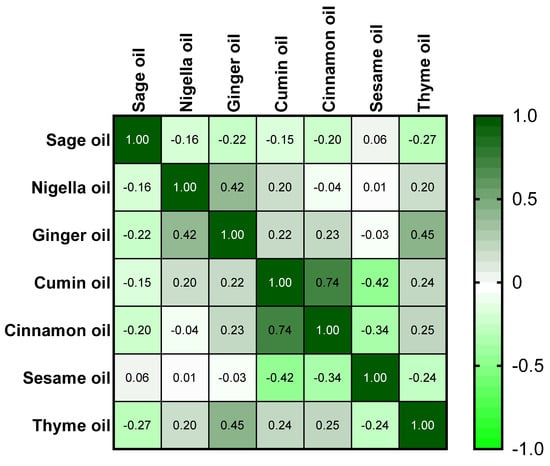 Pearson’s correlation coefficient between inhibition zones (mm) of essential oils against MDR Salmonella.