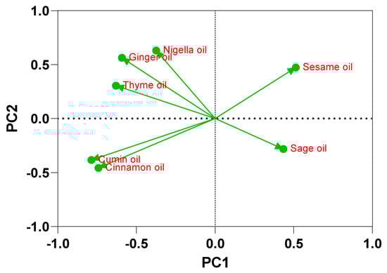 Cinnamon and cumin oils demonstrated the strongest antimicrobial activity among the tested oils, with inhibition zones ranging from 20 to 36 mm against Salmonella isolates through an agar well diffusion test (Figure S17). Principal component analysis (PCA) is a statistical technique used to reduce the dimensionality of data. In the context of essential oil activity, PCA can help to identify patterns and relationships between different oils based on their antimicrobial properties. By analyzing the inhibition zones of various oils against different microorganisms, PCA can group oils with similar antimicrobial profiles. PCA revealed a strong positive correlation between the inhibition zones of Nigella sativa oil and those of cumin and cinnamon oils (r = 0.744; p < 0.05, Figure 4). Factor analysis identified four factors that described 80.89% of the total data variability in the essential oil activity. The first dominant factor (35.85% of the total variance) described the combined effects of inhibition zones from ginger, cumin, cinnamon, and thymus oil. The second factor (20.93% of the total variance) revealed significant loading on the properties of Nigella sativa oil. The third component (12.64% of the total variance) gave a strong positive load to the activity of sage oil (Table 2 and Figure 5). PCA and factor analysis can help to optimize the formulation of essential oil-based products for various applications, such as food preservation, personal care, and medicine.
