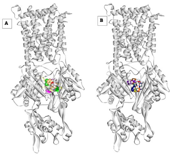 (A) 3D figure of the reference ligand (PDB ID: A1AN8) docked inside the target pocket of Salmonella MDR efflux pump acrAB. (B) 3D figure of the tested compounds occupying the same target site of reference compound inside the target pocket of Salmonella MDR efflux pump acrAB.