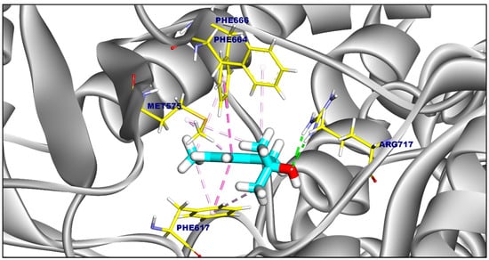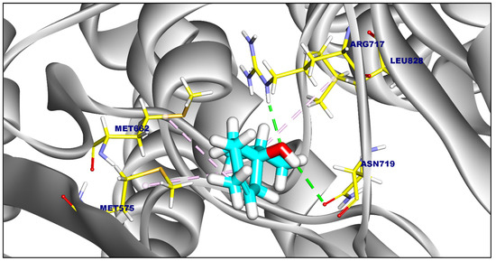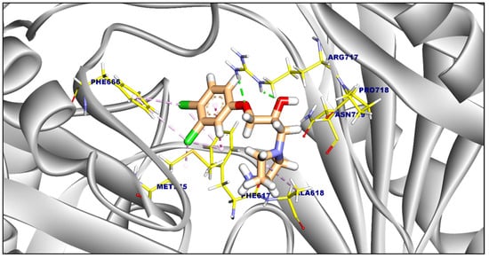 The reference compound (PDB ID: A1AN8) exhibited a binding affinity of −6.88 kcal/mol. It formed seven hydrophobic π-interactions with Ala618, Phe617, Met575, and Phe666, and two hydrogen bonds with Arg717 (2.17 and 2.29 Å) (Figure 9).
