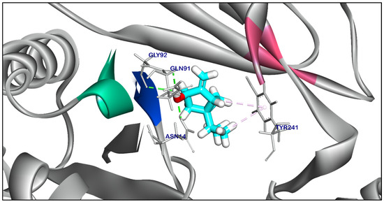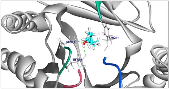 The binding mode of Compound 4 exhibited a binding energy of −5.56 kcal/mol. against Salmonella efflux pump target site. two hydrophobic π-interactions were observed with Glu239. Additionally, Compound 4 formed a hydrogen bond with Thr94 with a bond length of 2.18 Å (Figure S8). Moreover, Compound 12 exhibited an affinity score of −5.36 kcal/ mol, against Salmonella efflux pump target site. It interacted with Asn14, and Tyr241 by one hydrogen bond and one hydrophobic π-interaction with a bond length of 2.01 Å (Figure S9). The binding mode of Compound 13 exhibited an affinity score of −6.23 kcal/ mol. against Salmonella efflux pump target site. Compound 13 showed three hydrophobic π-interactions with Thr12, Tyr144, and Tyr241 (Figure S10). The binding mode of Compound 16 exhibited an energy binding of −5.61 kcal/ mol. against Salmonella efflux pump target site. It formed three hydrophobic π-interactions with Tyr241, Gln91, and Leu135, moreover formed two hydrogen bonds with Ser149, and Tyr241 with bond lengths of 2.15, and 1.98 Å (Figure S11).