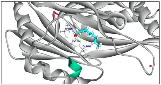 The binding mode of Compound 18 exhibited a binding energy of −7.29 kcal/ mol. against Salmonella efflux pump target site. Compound 18 formed two ionic interactions and one hydrophobic π-interactions with Glu289, Arg151, and Gly92. Moreover, Compound 18 interacted with Thr94 by one hydrogen bond with bond lengths of 2.22 Å (Figure S12). The binding mode of Compound 22 exhibited an energy binding of −5.41 kcal/ mol. against Salmonella efflux pump target site. Compound 22 formed two hydrophobic π-interactions with Tyr241, and formed two hydrogen bonds with Asn41, and Gln53 with distances of 2.15, and 2.36 Å (Figure 10). The binding mode of Compound 21 exhibited an affinity score of −6.21 kcal/ mol. against Salmonella efflux pump target site. Compound 21 formed a hydrophobic π-interaction with Glu91, additionally, three hydrogen bonds were obtained by interaction with Thr94, Gly92, and Gln91 with a distance of 2.04, 2.05, and 2.13 Å (Figure 11). The binding mode of Compound 23 and Compound 24 exhibited affinity scores of −5.23 and −6.27 kcal/ mol., respectively against Salmonella efflux pump target site. Compound 23 formed two hydrophobic interactions with Tyr241, and one hydrogen bond with Arg151 with a distance of 1.98 Å (Figure S13). while Compound 24 formed two hydrophobic interactions with Tyr144, and Tyr241, and additionally, interacted with Asn197 by one hydrogen bond with a bond length of 2.06 Å (Figure S14). The binding mode of Compound 25 exhibited a high affinity score equal −7.64 kcal/ mol. against Salmonella efflux pump target site. Compound 25 formed two hydrophobic π-interaction with Tyr241. Additionally, interacted with Gly92, Gln91, and Asn14 by three hydrogen bonds with bond lengths of 2.61, 2.11, and 2.54 Å (Figure 12). While Compound 29 exhibited ∆G score equal −5.87 kcal/ mol. against Salmonella efflux pump target site. Compound 29 formed two hydrophobic π-interactions with Tye144, and Tyr241, moreover interacted with Tyr241 by a hydrogen bond with a distance of 2.01 Å (Figures S14–S15).