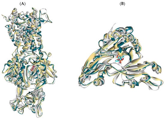 (A) 3D figure of Compound 24 against Salmonella MDR efflux pump AcrAB. (B) 3D figure of Compound 25 against Salmonella MDR efflux pump AcrD at 0 ns blue color, 50 ns yellow color, and 100 ns gray color.