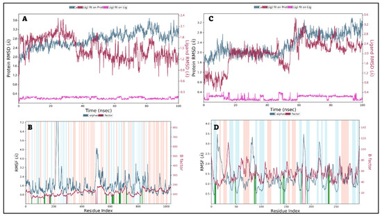 Root mean square deviation (RMSD) and root mean square fluctuation (RMSF) analysis of Compound 24 with AcrAB and Compound 25 with AcrD in Salmonella Typhimurium; (A,B) RMSD and RMSF plots for Compound 24 bound to AcrAB of Salmonella Typhimurium, simulated for 100 ns. (C,D) RMSD and RMSF plots for Compound 25 bound to AcrD of Salmonella Typhimurium, simulated for 100 ns.