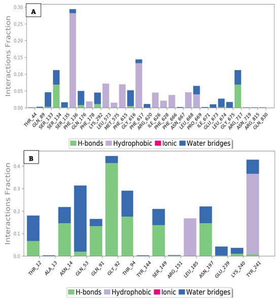 Histogram analysis describing the binding interactions of Compounds 24 (A) and 25 (B) with MDR efflux pump AcrAB and AcrD of Salmonella during the simulation time (100 ns).
