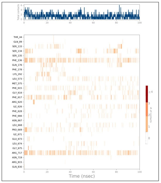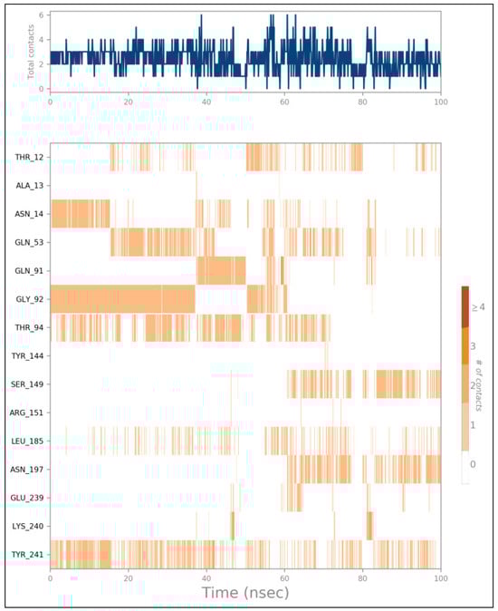 To analyze the dynamic nature of the protein–ligand interactions, heat maps were generated to visualize the number of interactions over time (Figure 16 and Figure 17). The heat maps revealed that both Compound 24/AcrAB and Compound 25/AcrD complexes formed up to four hydrogen bonds during the simulations. Key amino acid residues involved in the interactions with Compound 24 included Phe136, Phe617, and Arg717. Compound 25 interacted with Asn14, Gln53, Gly92, Thr94, Ser149, Tyr241, and Leu145.