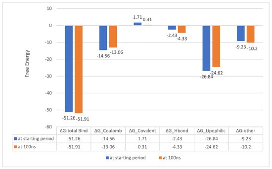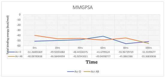 Molecular mechanics generalized born surface area (MM-GBSA) calculations were performed to estimate the binding free energies of the compounds with the AcrAB and AcrD complexes. The results indicate that Compound 25/AcrD exhibited a stable binding interaction throughout the simulation (Figure 18), while Compound 24/AcrAB showed a notable increase in free energy at the end of the simulation, suggesting a less stable interaction (Figure 19). From the next results, Compound 25/AcrD showed no change in ∆G from the starting period until the end of the simulation time, while Compound 24/AcrAB showed a notable increase in free energy at the end of the simulation time rather than the starting point, which indicates Compound 24/AcrAB has more stability at the end of simulation process (Figure 20).