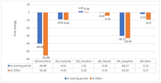 Molecular dynamics (MD) simulations were performed using the Desmond simulation package from Schrödinger LLC [45]. The NPT ensemble (heating at 0–300 K. Further, with the time step of 100 ps, the system normalized in an equilibrium state at 1000 steps. The final production run was kept for 100 ns, at the time steps of 100 ps, 300 K temperature and 1.01325 atm pressure, for both complexes applying the Nose-Hoover method with NPT ensemble) was used for all simulations, maintaining a temperature of 300 K and a pressure of 1 bar. The simulations ran for 100 nanoseconds, with a relaxation time of 1 picosecond for the tested ligands. The OPLS_2005 force field parameters were applied throughout the simulations. Long-range electrostatic interactions were calculated using the particle mesh Ewald method, with a cutoff radius of 9.0 Å for Coulomb interactions [46].