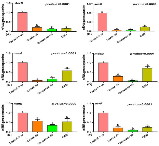 Modulatory effect of different treatments on efflux pump-related genes (A) acrB, (B) soxS, (C) marA, (D) mdsB, (E) mdtB, (F) acrF, (G) acrD, and (H) robA. Different letters (a,b,c,d) indicate significant changes.